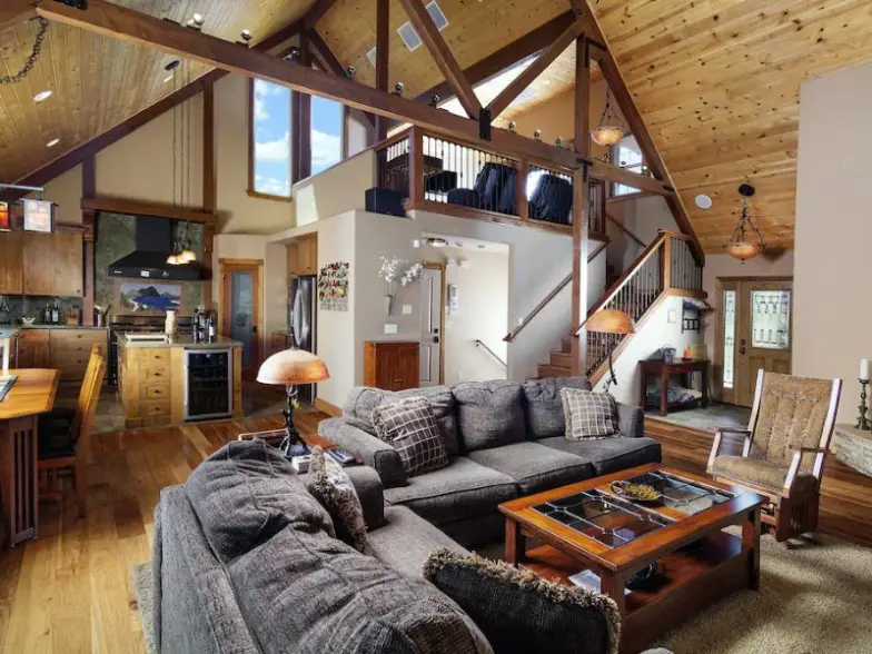 Con cuatro amplios dormitorios y tres baños, esta cabaña puede alojar cómodamente hasta 10 personas. Entonces, tal vez este sea el lugar perfecto para reunirse con la familia extendida. Un medio baño adicional agrega una pizca más de comodidad. Todo está pulido y totalmente hermoso.