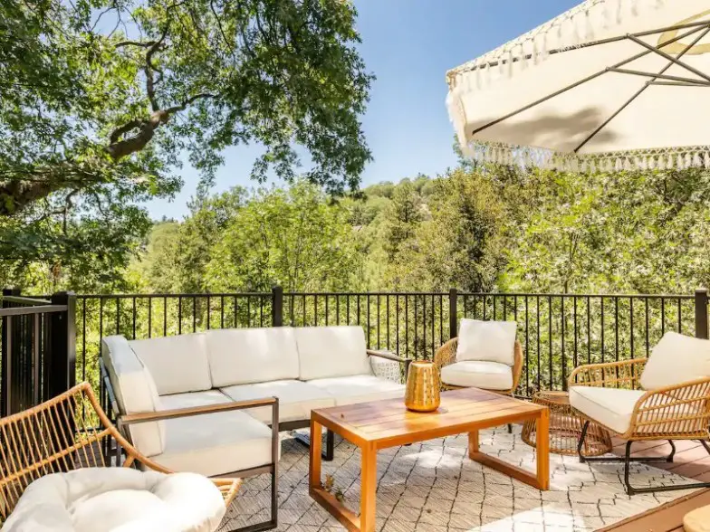 Una auténtica cabaña de troncos con una cálida chimenea, tragaluces que enmarcan las estrellas y una sensación de concepto abierto en todas partes: suena bastante parecido a la perfección, ¿verdad? Está. Y hay múltiples lugares en el porche para relajarse, con una taza de café caliente mientras sale el sol. Retírese del ajetreo y el bullicio a una verdadera experiencia de cabaña en la naturaleza.