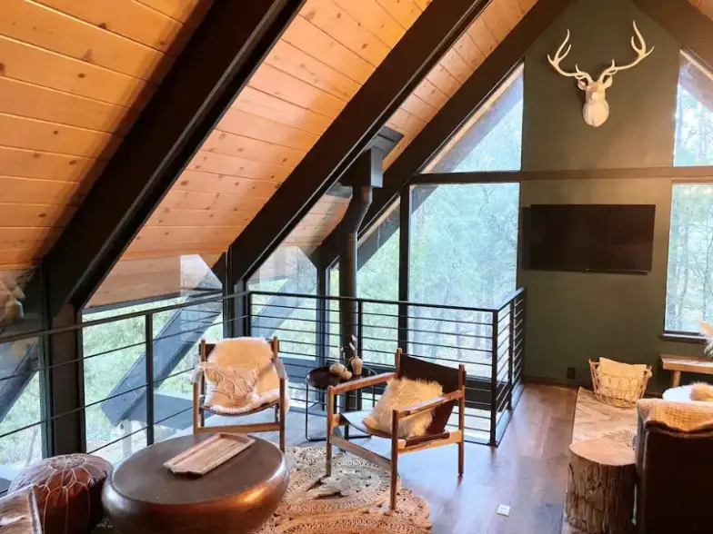 Estos marcos A actualizados realmente nos recuerdan lo increíblemente bien que encaja la elegancia con la naturaleza. El diseño de esta vivienda es impresionante, ya que el techo de madera y otros atributos de la cabaña agregan esa sensación de calidez, mientras que los accesorios de iluminación contemporáneos, el papel tapiz divertido y la elegancia sutil lo unen todo de la manera más fascinante.