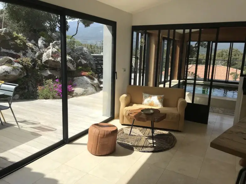 Esta moderna villa con vistas al mar, excelentemente valorada, sería una elección increíble para un grupo grande. Ubicada en una vasta campiña corsa con llanuras y bosques, la casa nunca está demasiado lejos de las playas. Con una isla de cocina espaciosa, decoraciones deliciosas y un espacio al aire libre increíble con una piscina climatizada, este Airbnb es definitivamente un libro imprescindible en la parte sur de la isla.