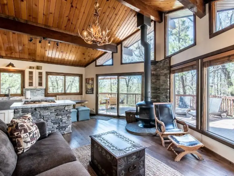 Si está buscando una experiencia desconectada donde simplemente pueda disfrutar de la paz y la tranquilidad junto con vistas impresionantes y una gran cantidad de aventuras al aire libre, esta cabaña de tres habitaciones puede ser ideal. Está ubicado en la ciudad de Strawberry, cerca de Pinecrest Lake y Dodge Ridge Ski Area en las montañas centrales de Sierra Nevada. Tendrá un excelente acceso a rutas de senderismo, esquí y también al South Fork del río Stanislaus. Desde la gran terraza, puede disfrutar de la vista del río, o incluso lanzar su línea para pescar su cena. También hay una bañera de hidromasaje para relajarse con la vista; el único inconveniente es que es posible que no desee volver a la realidad del "mundo real" después.