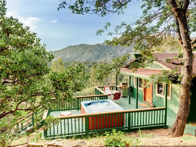 Uno de los alquileres de cabañas más populares en los EE . UU ., este Airbnb es un paraíso para los amantes de la naturaleza. Ubicada a poco más de una milla del centro de Julian, una antigua minería de oro, esta cabaña se convirtió de un puesto de observación de incendios en un alquiler de vacaciones de lujo. Ubicado en un santuario privado y tranquilo con vistas panorámicas del bosque y la Reserva de la Montaña Volcán, incluso tiene su propio spa de aguas termales. Incluye dos dormitorios, con capacidad para seis personas, con techos altos y ventanales, se siente muy espacioso. Hay una larga lista de comodidades, algunas de las cuales incluyen un regalo de bienvenida de vino tinto o blanco y chocolate negro o con leche, una estufa de leña noruega Jotul, una parrilla de alta gama, una colección de discos antiguos, arte, clásicos libros y antigüedades s.