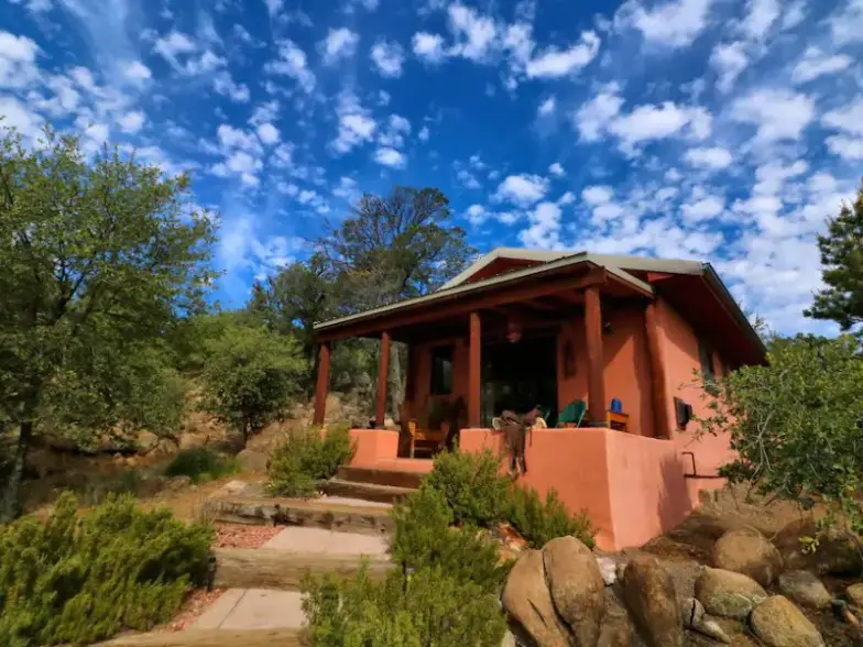 Esta es una cabaña popular de Airbnb que está a 15 minutos del centro de Santa Fe y en una comunidad semi-rural. Tiene capacidad para cinco personas y tiene dos dormitorios y un baño. Tendrás tu propia terraza aquí y millas de senderos para caminar y andar en bicicleta. Es una casa estilo casita de dos pisos de altura y al lado de la casa del anfitrión. Viene con una cocina totalmente equipada y se encuentra en un área de cielo oscuro sin farolas para ayudarlo a disfrutar de los increíbles cielos nocturnos y las estrellas arriba. Los servicios proporcionados incluyen desayuno, lavadoras, Wi-Fi y estacionamiento gratuito. Se admiten mascotas aquí cuando paga una tarifa por mascota de $50.