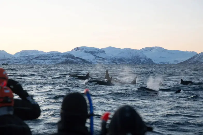 ¿Por que hacerlo?Ponte un traje seco y abrigado, un esnórquel y una máscara para flotar cómodamente en la superficie del agua con las orcas. Una experiencia transformadora, podrá escuchar a los animales comunicarse entre sí, tal vez hablando sobre su festín de arenques, algo que verá muchos mientras se sumerge en su mundo en lugar de ser un simple observador.