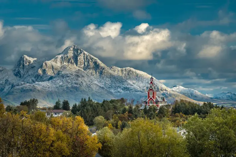 Es bueno saberlo: el que se encuentra hoy aquí en el pueblo de Gravdal en la isla de Vestvågøya fue consagrado en 1905 y cuenta con un impresionante telón de fondo montañoso.