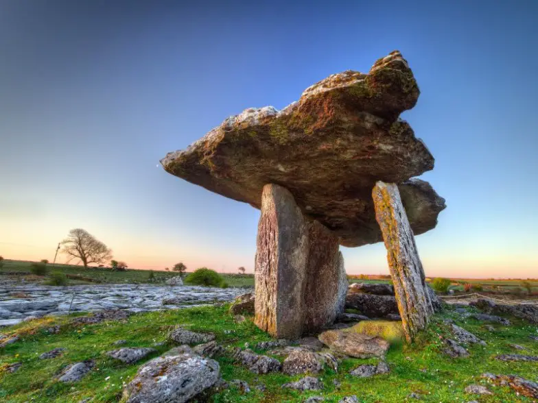 Si bien puede parecer un lugar árido y árido con el paisaje cubierto de piedra gris pálido entrelazada con riscos y grietas, The Burren es famoso por su diversidad de flora y fauna, con un microcosmos de la vida silvestre del país junto con plantas árticas-alpinas que prosperan, creciendo junto a otras que normalmente se encuentran en el Mediterráneo. Hay una serie de especies que son raras en otras partes del planeta, sin embargo, son abundantes aquí y todas logran sobrevivir en un lugar que parece estar hecho casi en su totalidad de roca. Las visitas también pueden ver el dolmen de Poulnabrone, una tumba portal cuyo nombre se traduce como "el agujero de los dolores". Se remonta al período Neolítico, en algún momento entre 4200 aC y 2900 aC.