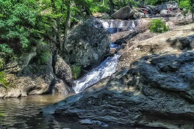 Cunningham Falls es la cascada más grande del estado y está ubicada en el Parque Estatal Cunningham Falls de 6,080 acres.
