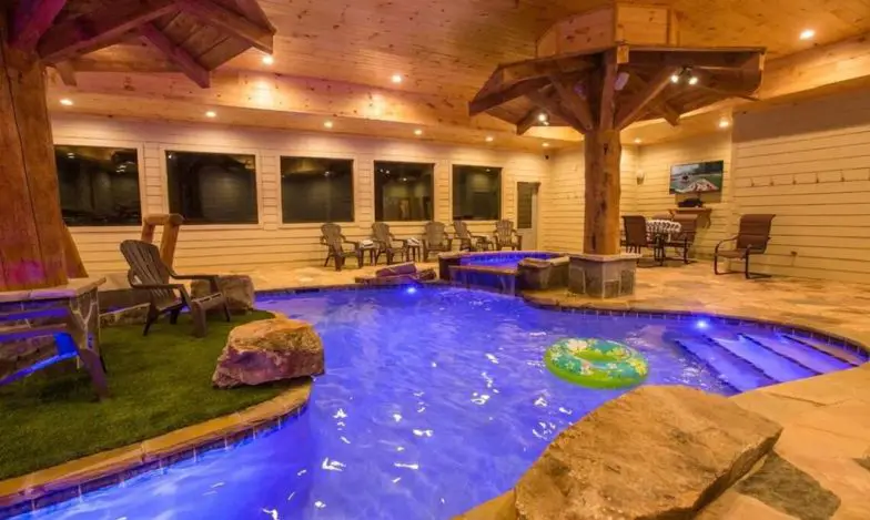 Un albergue/cabaña de montaña de seis habitaciones cerca de Pigeon Forge, Eagle River Lodge puede acomodar hasta 24 huéspedes y cuenta con innumerables características de lujo, que incluyen una piscina cubierta privada con un mini patio, cascadas y efectos de iluminación. Hay un loft de juegos con un televisor de pantalla grande, una mesa de billar y Xbox One, así como una sala de cine y televisores de pantalla plana en las habitaciones. Además, la cocina grande tiene dos de todo, incluidos hornos, microondas empotrados, refrigeradores, lavavajillas y fregaderos, lo que facilita la preparación de comidas para un grupo grande.