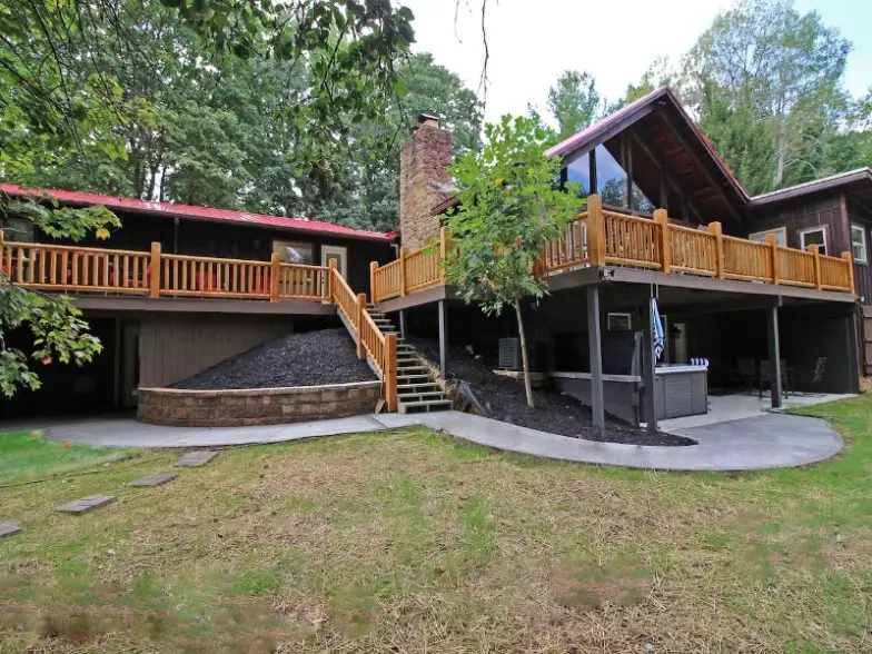 Ubicado a solo minutos del pintoresco Parque Estatal Hocking Hills, High Point Lodge es ideal para grupos grandes, con capacidad para al menos 16 con ocho habitaciones y 6,500 pies cuadrados. Una cabaña de troncos tallada a mano original, este lujoso espacio es una mezcla de lo histórico y lo moderno, con una piscina cubierta de agua salada en una casa de la piscina separada que incluye un baño, muebles de jardín y un refrigerador grande. También incluye una bañera de hidromasaje cubierta para relajarse y un anillo de fuego para asar malvaviscos. Solo algunos de los otros aspectos destacados son una mesa de billar, una mesa de cóctel de arcade de 60 juegos, tejo, mesa de juego de bolos, seis televisores de pantalla plana vía satélite y un juego grande para los niños con columpios, un tobogán, barras de mono y un fuerte. .