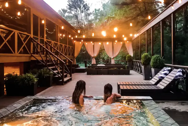 Un popular alquiler de vacaciones en West Virginia , esta lujosa cabaña de cuatro habitaciones frente al río tiene capacidad para 11 personas, ubicada al pie de Ice Mountain. Sus espacios de vida al aire libre son lo más destacado, que incluyen una bañera de hidromasaje y un spa de inmersión climatizado de tres estaciones en la terraza, una chimenea apilada de piedra y una mesa de campo francesa para 12 personas para cenar al aire libre. También puede esperar relajarse con los sonidos del río en el enorme porche cubierto con vistas a la montaña. En el interior hay una cocina con todo lo que necesita para preparar sus propias comidas y una suite principal romántica con una cama con dosel tamaño king y un baño principal de mármol contiguo con una bañera grande y una ducha separada de gran tamaño con chorros.