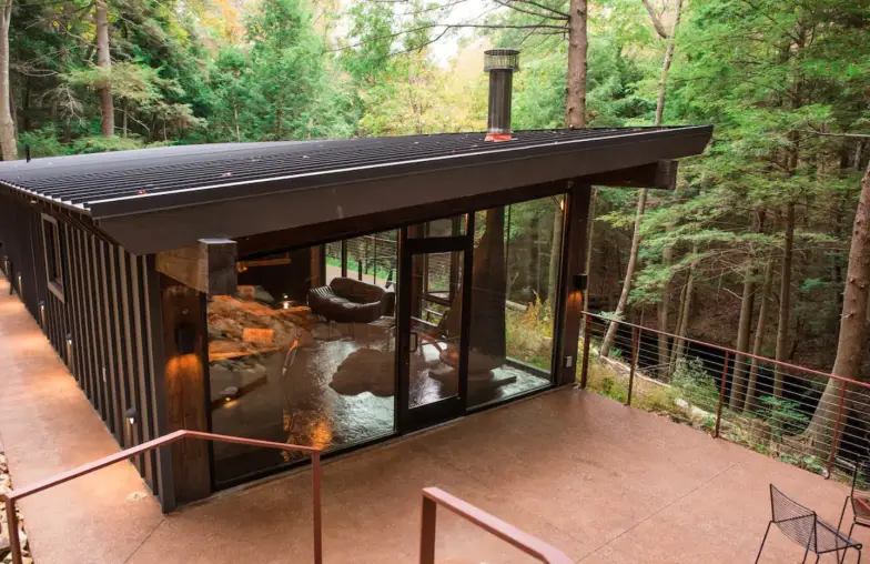 The Ledge@LostCavern es un sueño arquitectónico inspirado por los renombrados arquitectos Frank Lloyd Wright y Philip Johnson. Desde las ventanas del piso al techo, contemple las fabulosas vistas de las cascadas estacionales y las cuevas circundantes en la pintoresca zona de Hocking Hills. Tendrá mucha privacidad en esta ubicación apartada en 24 acres, con muchas rutas de senderismo cercanas, junto con características como una bañera de hidromasaje y chimeneas interiores y exteriores a las que volver.