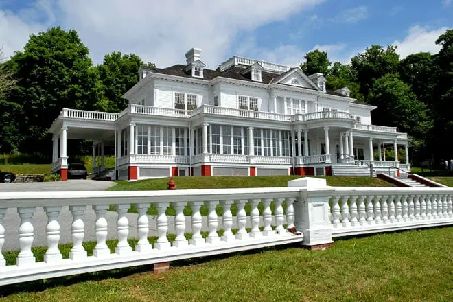 Esta propiedad de 3,500 acres alberga una mansión de renacimiento colonial de 23 habitaciones, 25 millas de exuberantes caminos para carruajes, dos lagos artificiales y huertos de manzanos que cambian de color con las estaciones.