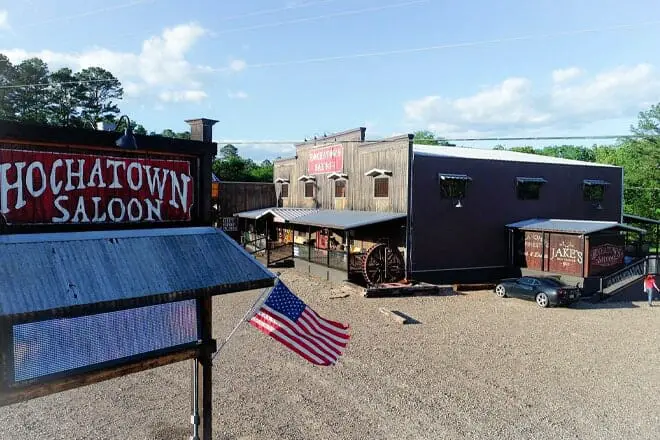 El Hochatown Saloon es un restaurante que se convierte en un bullicioso club nocturno cuando se pone el sol.