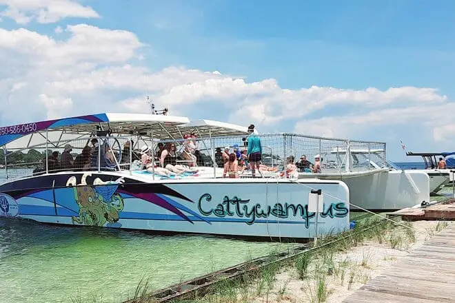 El catamarán Cattywampus es un catamarán de doble casco y baja altura que puede transportar hasta 43 pasajeros en eco-cruceros en el Golfo de México.
