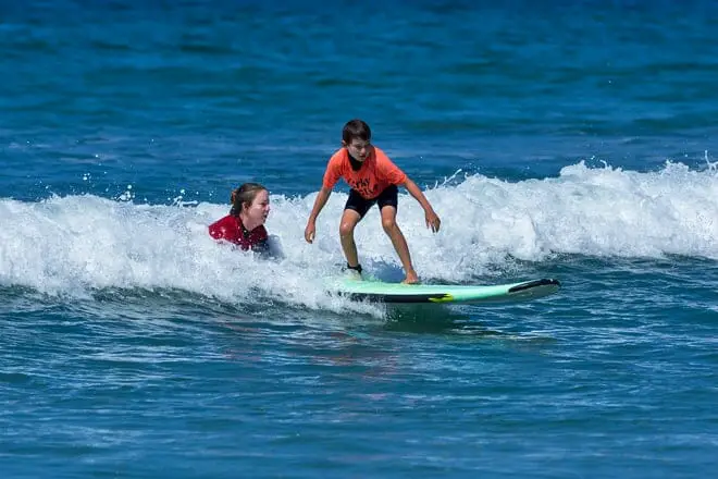 Brindando orientación paso a paso, los niños aprenderán rápidamente los conceptos básicos del surf con la proporción de estudiantes por instructor de 3:1 de la escuela.