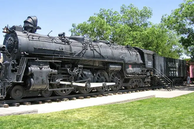 Suba a bordo de la máquina de vapor AT&SF #3759. Luego, pasee por los verdes terrenos del parque o disfrute de un picnic con la familia.