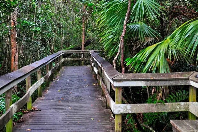 Rodeado de una exuberante vegetación que incluye árboles de gumbo-limbo, plantas de aire y el árbol de caoba vivo más grande de los EE. UU., el Mahogany Hammock Trail es una breve aventura a través de la rica biodiversidad de los Everglades.