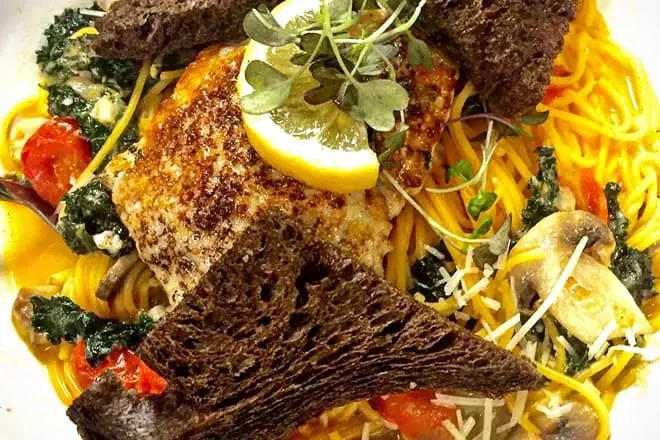 Pruebe sus ensaladas frescas, champiñones portabella, sándwiches de queso a la parrilla y hamburguesas. En cuanto al postre, no te puedes equivocar con el Key Lime Pie o el pastel gigante casero de 60 capas de Sheila.