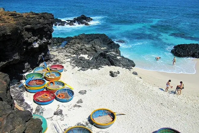 A diferencia de la mayoría de las playas de Vietnam, la arena de Quy Nhon es de un suave beige tostado por el sol, lo que agrega un tono único al esquema de color habitual de la costa. La playa principal puede llenarse de barcos de pesca, mientras que las áreas norte y sur ofrecen paisajes montañosos y formaciones rocosas espectaculares.