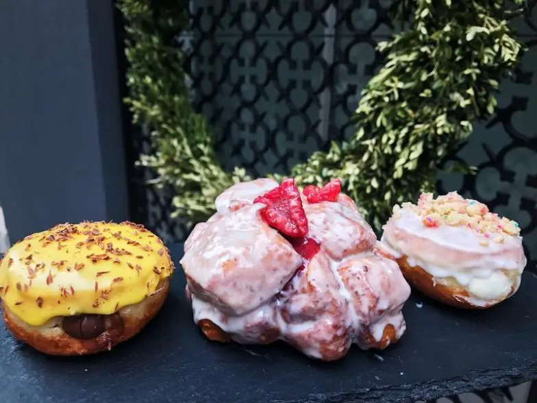 La dona Pon De Ring del Dough Club tiene una forma distintiva, que parece varias esferas ligeramente fusionadas, que finalmente forman la forma del círculo. Estos son donuts de mochi al estilo japonés. ¡Y si! Tienen esa deliciosa textura masticable. El té verde y los cereales crujientes y afrutados son algunos de los aderezos incorporados en las golosinas con nombres adorables. ¡La estética de la tienda es igualmente preciosa!