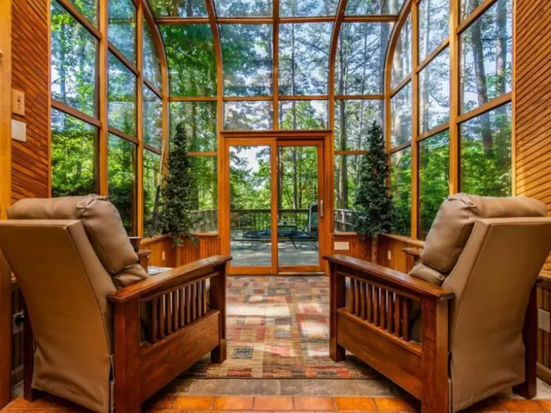 Apodado "el santuario", probablemente no haya un mejor término para describir esta estructura similar a una cabaña, que también está construida con piedra nativa. Un solárium, que cuenta con una pared de vidrio completo y un techo de vidrio parcial, permite a los huéspedes sumergirse verdaderamente en los árboles y la naturaleza de los alrededores. Ubicado dentro de la gran terraza, que se abraza contra las paredes cubiertas de hiedra de la casa, hay una bañera de hidromasaje y una mesa de billar.