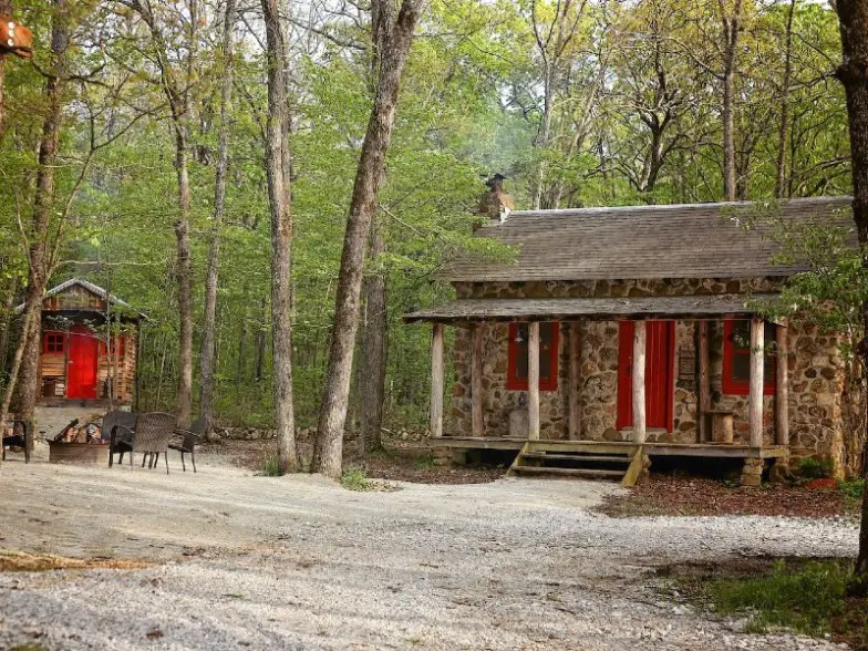 A solo 10 minutos de las tiendas y cervecerías de Houston, Missouri, la cabaña de piedra parece estar a un mundo y siglos de distancia. El interior es verdaderamente naturalista y acogedor, e incluso la letrina es bastante linda. La propiedad cuenta con un maravilloso espacio para parrillas y una moderna piscina con tanque de almacenamiento. Los lugares de pesca de truchas están cerca, pero el estanque en el lugar está lleno de peces, que los huéspedes también pueden pescar.