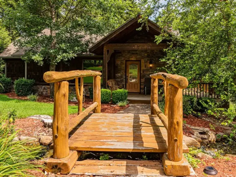 En Branson, los viajeros pueden disfrutar tanto del lujo como de la naturaleza cuando se retiran a la vida de cabaña durante una semana. Piedra apilada, ricos tonos de madera, una enorme chimenea y un impresionante paisaje con un pequeño puente: estas son solo algunas de las impresionantes características de la cabaña.