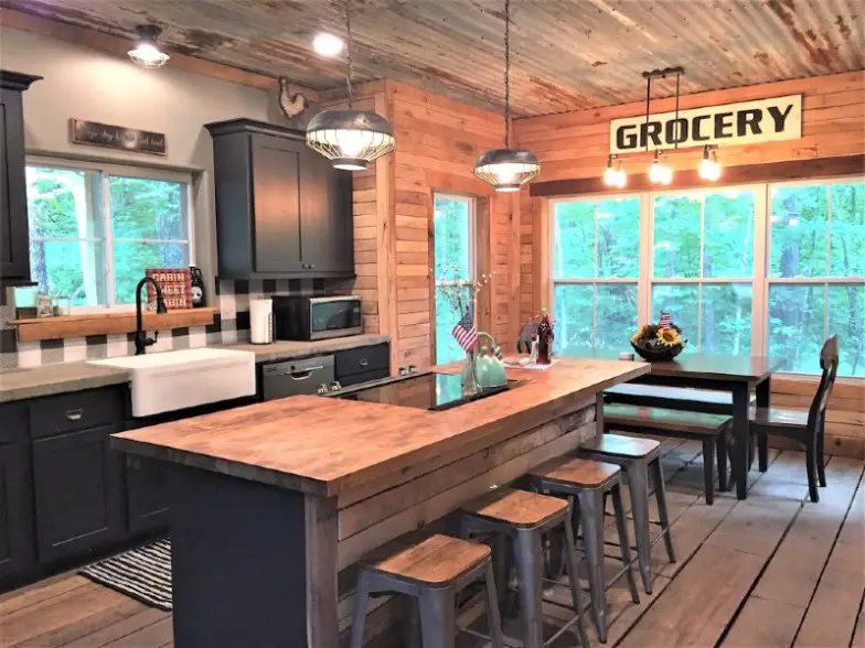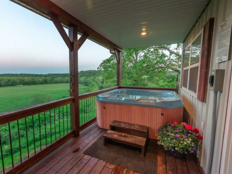 Modern redefine la experiencia de la cabaña en Aldrich, Missouri. Azulejos de mosaico, una ducha tipo lluvia y otra estética elegante completan el interior. Pero es probable que el patio pase la mayor parte del tiempo de los invitados. Una bañera de hidromasaje, un llamativo voladizo, una hoguera y una cascada se han unido para crear un oasis de lujo. Las estrellas también son impresionantes aquí.