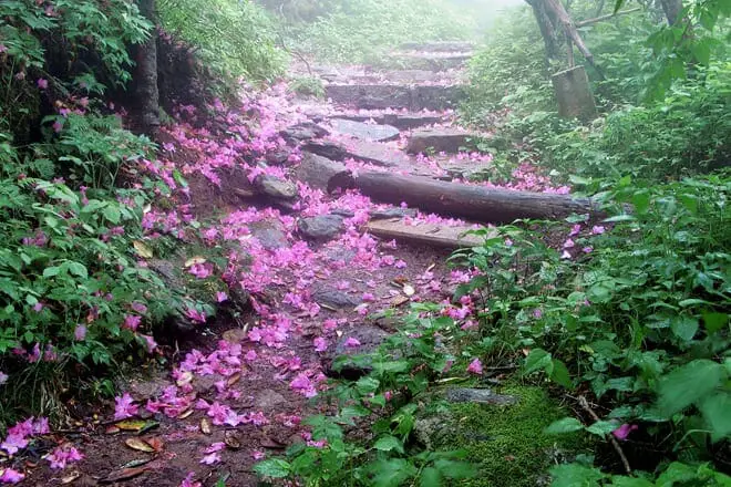 Craggy Gardens es conocido porque está cubierto de rododendros púrpuras de Catawba. Es menos de una milla de caminata para llegar aquí cuando comienza desde el poste de la milla 361.2 en Blue Ridge Parkway.