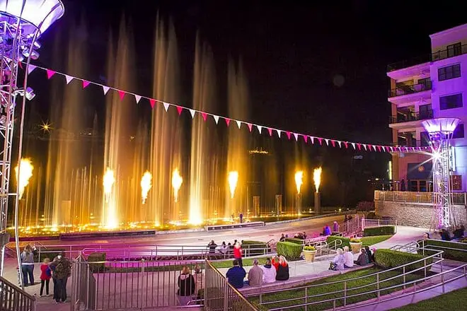 Junto con más de cien tiendas y restaurantes, el centro comercial al aire libre ofrece una de las cosas gratis más inolvidables para hacer en Branson: géiseres de fuente de 100 pies y columnas de fuego que bailan al ritmo de las luces y la música.