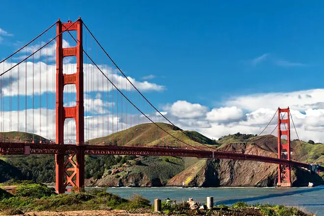 El puente Golden Gate es el icónico puente colgante rojo que conecta San Francisco con el condado de Marin. Tiene una longitud de 1,6 km. El puente se inauguró en mayo de 1937.