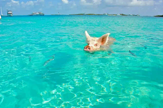 Alquile un barco o realice una visita guiada a Pig Beach. A su llegada, juegue con los cerditos y disfrute de las resplandecientes aguas cristalinas de la isla. Por supuesto, no puedes irte de la isla sin hacerte un selfie con estas adorables criaturas rosadas.