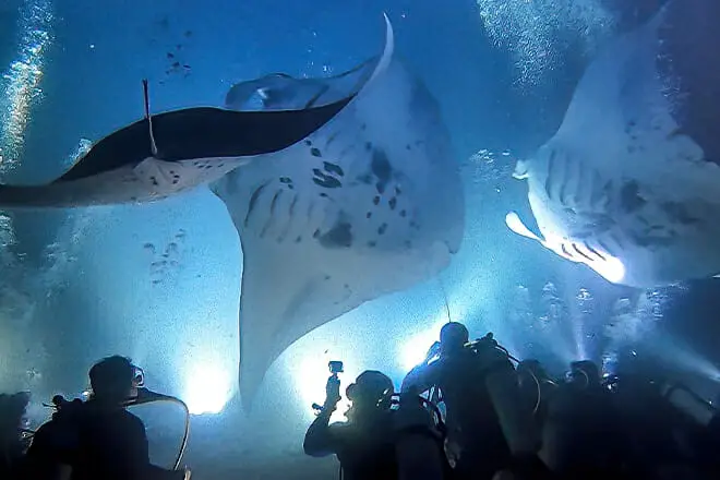 Durante tres horas después de la puesta del sol, Kona Diving Eco-Adventures lo lleva al lugar de reunión en alta mar de cientos de rayos.