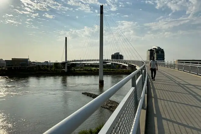 El puente peatonal Bob Kerrey es un puente peatonal de 3000 pies que cruza el río Missouri y sirve como intersección entre tres ciudades: Council Bluffs, Iowa y Omaha.