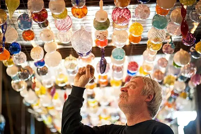 Visite los diversos estudios y tenga la oportunidad de ver las obras de arte y las piezas mientras aprende cómo están hechas con sus diferentes medios, que incluyen acuarelas, óleos, acrílicos, arte en fibra, fotografía, pasteles, joyería, grabado, vidrieras, vidrio fundido y mucho más.