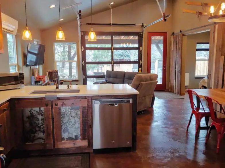 Al ser completamente nuevo, se encuentra en esta cabina un tipo diferente de atractivo entrañable, en lugar de esa estética más antigua. Sin embargo, los artesanos locales ayudaron a construir la casa con materiales recuperados, lo que le da al espacio un aspecto enriquecedor que rivaliza con las estructuras más históricas. El Old Mill District, donde encontrará parte de la escena cervecera y vinícola de Bend, está literalmente afuera.