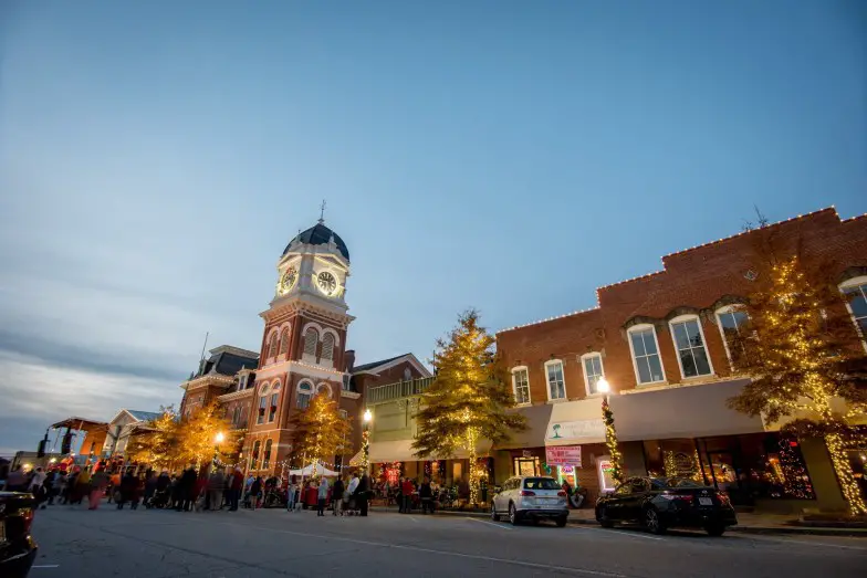 No muy lejos de Conyers se encuentra la animada Covington Square, repleta de restaurantes eclécticos, una heladería y una adorable panadería con muchos dulces navideños. No solo encienden el árbol, sino que toda la plaza del pueblo estallará en una obra maestra centelleante mientras los coros locales agregan sonidos angelicales al momento mágico.