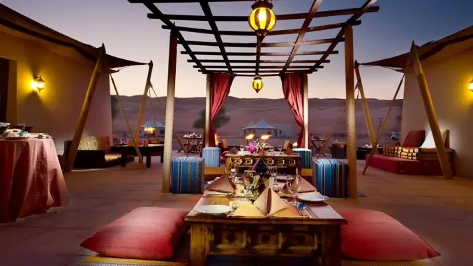 Desert Nights Camp, el único campamento de lujo en el desierto en Omán, es una base ideal para una aventura en el desierto árabe, con espectaculares montañas escarpadas en la distancia, dunas interminables y wadis cristalinos. Está a solo dos horas en coche de Mascate. El campamento se extiende sobre 10 acres de arenas sedosas dentro del vasto aislamiento del desierto de Omán. Las 30 lujosas tiendas de campaña de estilo beduino con aire acondicionado cuentan con asientos cómodos al estilo de Omán, lujosas camas bajo un dosel de lino inundado de luz dorada, habitaciones con azulejos, muebles árabes de buen gusto y baños estilo boutique. Cada noche, los invitados se deleitan con comida tradicional omaní bajo el resplandor parpadeante de la fogata.