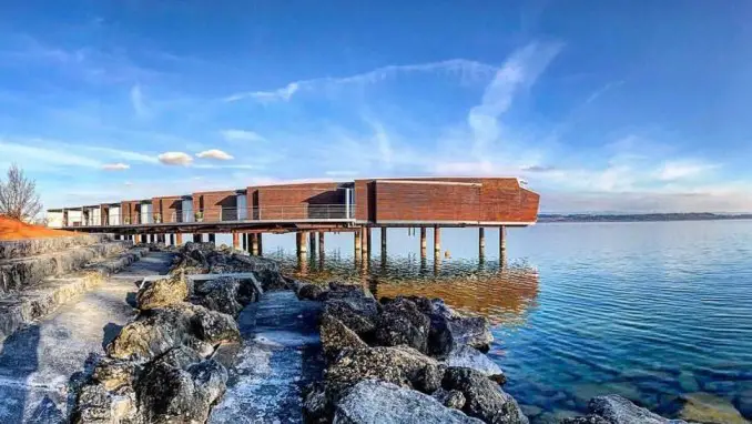 El Hotel Palafitte está ubicado en la ciudad de Neuchâtel-Monruz en la esquina noroeste de Suiza, con vista al lago Neuchâtel, el lago más grande de Suiza. Con 40 pabellones en total, 24 de los cuales están sobre pilotes sobre el lago, la propiedad es el único complejo de bungalows sobre el agua en toda Europa. El hotel fue construido en 2002 como parte de la exposición nacional suiza Expo.02. Al elegir construir el hotel sobre pilotes, los diseñadores crearon un vínculo fascinante con la historia antigua del sitio: en la zona, los arqueólogos han descubierto los restos de casas más antiguas de Suiza, construidas sobre pilotes. El complejo de bungalows sobre el agua es popular entre los grupos empresariales y para retiros, pero también es elogiado por su magnífica ubicación e incluso la multitud de luna de miel parece aprobarlo.