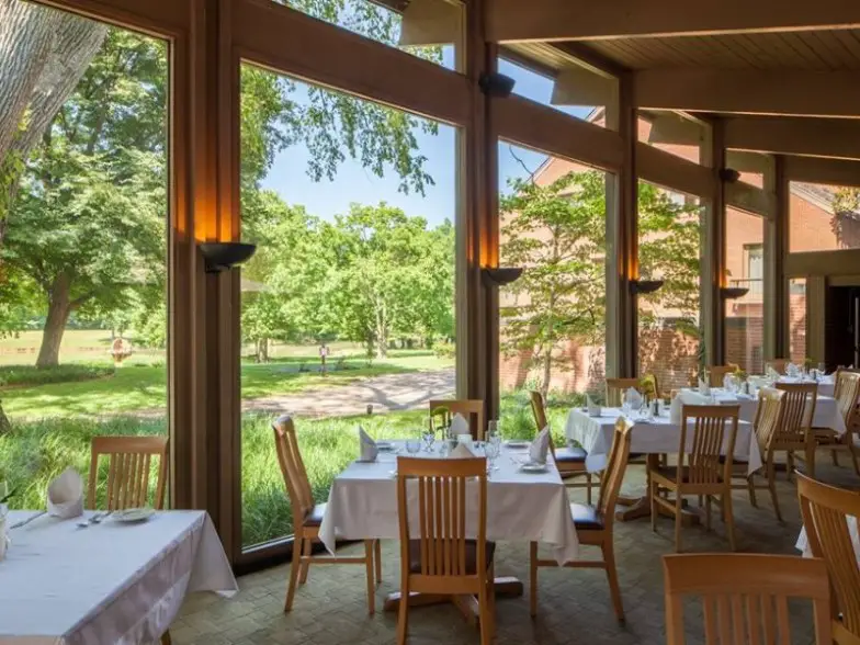 También puede reservar una estadía de una noche en el New Harmony Inn Resort & Conference Center, que es ideal para escapadas románticas, bodas y conferencias corporativas. El resort ofrece numerosas ofertas especiales para lunas de miel, aniversarios y cenas. El restaurante Red Geranium del hotel sirve desayunos, almuerzos, cenas, brunch y postres. Varias opciones de habitaciones tienen chimeneas, vistas al lago, espacios tipo loft y vistas al patio. Hay elegantes habitaciones y suites aquí, así como casas de huéspedes históricas con jardines privados. Otras comodidades en la propiedad incluyen canchas de tenis al aire libre, bicicletas de cortesía, alquiler de carritos de golf, piscina climatizada en el jardín y el Moon River Spa frente al restaurante. El estacionamiento y la conexión Wi-Fi son gratuitos y se admiten mascotas.