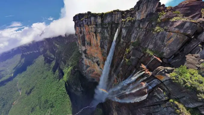 El Parque Nacional Canaima es el sexto Parque Nacional más grande del mundo, se extiende sobre 3 millones de hectáreas en el sureste de Venezuela a lo largo de la frontera entre Guyana y Brasil. La mayor parte de la superficie del parque está cubierta por montañas de mesa (tepui) que forman un fabuloso paisaje de acantilados y cascadas. Los tepuyes son de gran interés geológico ya que representan entidades biogeológicas únicas. Canaima es también el hogar de Angels Falls, que es la cascada más alta del mundo (979 mo 3211 pies). Las cataratas llevan el nombre de Jimmy Angel, un piloto estadounidense y aventurero en busca de oro, quien descubrió las cataratas en 1937. La altura de las cataratas es tan grande que antes de acercarse al suelo, los fuertes vientos atomizan el agua y la convierten. en la niebla.