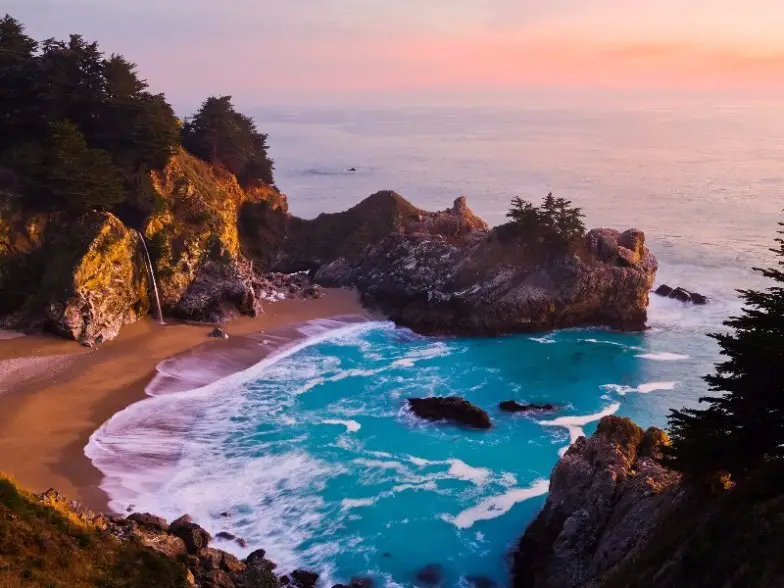 Big Sur se encuentra en la costa central de California, un área que a menudo se conoce como la propia Riviera italiana del estado con sus costas de estilo mediterráneo. Por un lado, frondosos bosques se extienden hasta el borde de calas escondidas, mientras que profundos desfiladeros atraviesan escarpadas montañas. La región ha inspirado a innumerables artistas, poetas y escritores, y es fácil ver por qué. Incluso encontrarás cascadas que se sumergen en hermosas extensiones de arena y una de las playas más singulares del mundo, Pfeiffer State Beach. Esta rara playa de arena púrpura obtiene su tonalidad de los depósitos de granate de manganeso que se encuentran en las rocas circundantes. Con las olas del color de las joyas chocando contra él, el contraste es simplemente asombroso.