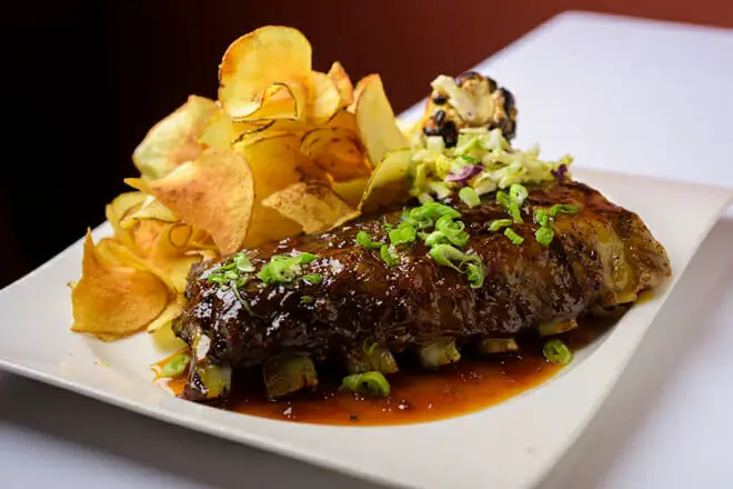 Ordene el Korean Ssam para probar un plato de inspiración asiática. Estas son costillas a la parrilla con kimchi casero, varias hierbas, aceite de cebolleta, arroz jazmín con ajo negro y lechuga con mantequilla.