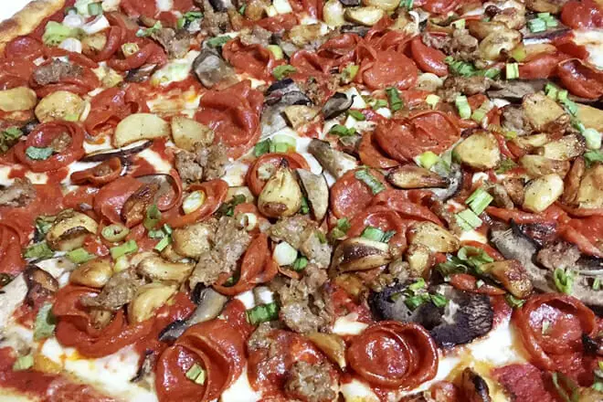 Satisfaga su apetito carnívoro ordenando el Maverick's. Sus ingredientes incluyen tocino canadiense, salchichas, pepperoni y salami.