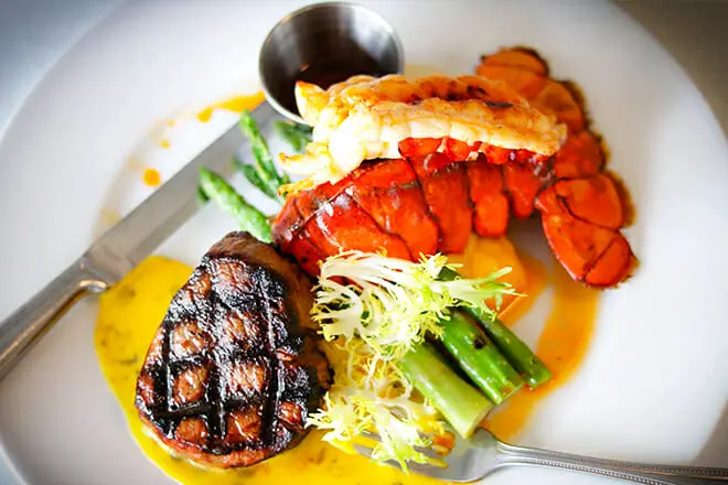 Pruebe la sopa de cebolla francesa horneada como aperitivo, el salmón cubierto con cangrejo como plato principal y el tres leches como postre.