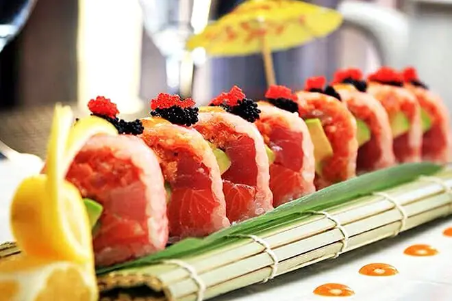 Prueba el Rollito Primavera de Takoyaki y Verduras como aperitivo. Luego, obtenga el Special Sushi & Sashimi Heaven para una combinación de rollos de sushi y sashimi servidos en un bote de madera.