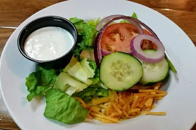Muchos también apreciaron la ensalada saludable que incluye pepinos, tomates, zanahorias, cebollas y verduras de hojas verdes, servida con aderezo casero de queso azul.