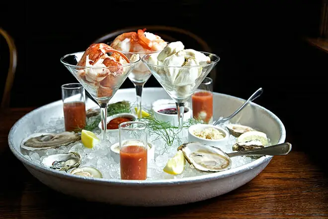 Comience con una porción de ostras y un tazón de sopa de almejas de Nueva Inglaterra. Siga esto con un plato de langosta al vapor servido con papas asadas al horno.