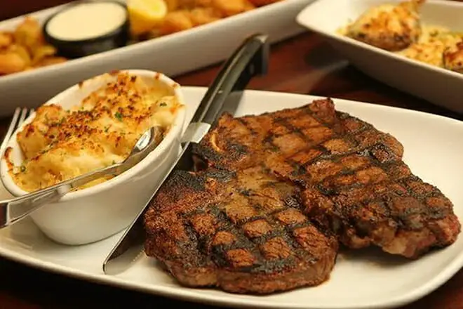 Pruebe los sabores audaces de su temporada alta y el menú de exhibición del chef o los platos principales como el pollo con costra de queso parmesano o el salmón LongHorn.