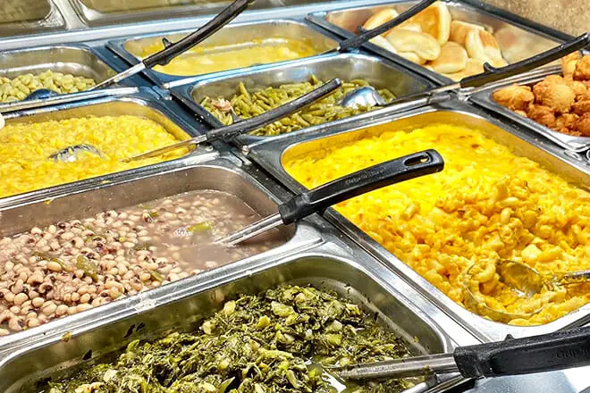 Venga a almorzar para probar las costillas a la barbacoa, los dedos de pollo frito y los macarrones con queso. Si te encantan las verduras, entonces los grelos, las papas, los guisantes y las judías verdes serían una gran adición a tu comida.